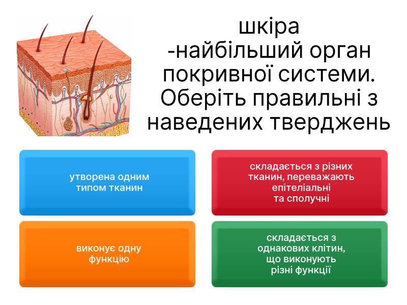 1) шкіра -найбільший орган покривної системи. Оберіть правильні з наведених тверджень a) утворена одним типом тканин b) складається з різних тканин, переважають епітеліальні та сполучні c) виконує одну функцію d) складається з однакових клітин, що виконують різні функції 2) Визначте правильну послідовність розташування тканин шкіри, починаючи з периферії: 1-щільна сполучна тканина з волокнами,2-пухка сполучна тканина з великою кількість капілярів,3- багатошаровий зроговілий епітелій,4- пухка сполучна тканина з жировими клітинами a) 1-2-3-4 b) 4-3-2-1 c) 2-3-4-1 d) 3-1-2-4 3) Секрети цих шкірних залоз людини містять воду і беруть участь в водно -сольовому обміні, терморегуляції та вигодовуванні малят Назвіть їх a) підшлункові b) сальні c) потові d) слинні e) шлункові f) молочні 4) 80% тепловіддачі здійснюється через шкіру. Назвітьс посіб фізичної терморегуляції за участі води(1) та фізичну властивість води, що є основою цього процесу(2) a) 1-випромінювання,2-теплоємність b) 1-теплообмін,2-теплопровідність c) 1-конвекція,2-текучість d) 1-потовиділення,2-випаровування 5) Структурно -функціональною одинецею нирок є a) ацинус b) остеон c) нефрон d) синапс 6) Оберіть правильні твердження щодо елементів будови нефрона та процесів за їхньою участю a) елемент 1 це капсула нефрона з капілярним клубочком де відбувається фільтрація крові і утворення первиннох сечі b) елемент 2 -сечозбірна трубка, яка відводить від нефрона вторинну сечу c) елемент 3 -звивистий каналець длчя реабсорбції та секреції та утворення вторинної сечі