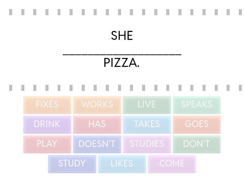LIKES - SHE ___________________ PIZZA., HAS - KATE _______________ TWO CHILDREN., WORKS - LUKE ________________ AT EMBRAER., LIVE - MY PARENTS _____________ IN CANADA., STUDIES - MY BROTHER _______________ ENGLISH AT ACHIEVE., DOESN'T - MARRY ___________________ LIKE BROCCOLI., SPEAKS - BOB ________________ SPANISH AND ITALIAN., GOES - SHE ___________________ TO WORK BY BUS., DRINK - JOHN AND PETER __________________ A LOT OF BEER., TAKES - SHE _________________ A SHOWER ONCE A DAY., PLAY - MY CHILDREN __________________ SOCCER., FIXES - MY UNCLE _____________________ CAR, HE'S A MECANIC., DON'T - I _______________________ LIKE CHINESE FOOD., COME - THEY _________________ FROM MEXICO., STUDY - WE ___________________ AT ACHIEVE LANGUAGES.,