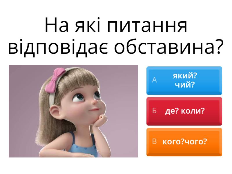 1) На які питання відповідає обставина? a) який? чий? b) де? коли? c) кого?чого? 2) Поширеним називають речення, ... a) у якому є один головний член b) у якому наявні підмет і присудок c) у якому є другорядні члени 3) У якому реченні виділене слово є додатком? a) Шиють сови заметіль шовкову. b) Земля крізь сніг прочинила чорні віконця. c) Живе собі кульбаба сива від роси. 4) На які питання відповідає означення? a) кого? чому? ким? на чому? b) який? чия? котре? c) де? коли? навіщо? 5) У якому реченні правильно виділене означення? a) І вирушає в плавання маленький корабель. b) Не силою роби, а розумом. c) Небо тихо грає і тремтить. 6) Назви вид другорядного члена речення, що характеризує дію з точки зору місця, часу, причини, мети, способу. a) означення b) додаток c) обставина 7) Яким членом речення виступає в поданому реченні підкреслене слово: "Верби у воді гілля полощуть". a) означення b) додаток c) обставина 8) Визнач речення з обставиною місця. a) Угорі світив місяченько. b) Тихо  верба розмовляє з водою. c) Щороку лелеки несуть на своїх крилах весну. 9) Визнач речення з додатком. a) Тут бували наймудріші люди. b) Дме свіжий ласкавий вітерець. c) Темряву тривожили криками півні... 10) Вибери додаток у реченні: " Рання пташка дзьобик чище..." a) рання b) дзьобик c) пташка 11) Визнач, які другорядні члени речення наявні у синтаксичній конструкції:" Тихо скриплять і ридають старі дерева" .  a) означення й обставина b) обставина й додаток c) означення і додаток 12) Визнач, якого другорядного члена немає в реченні: " Зашепотіло літо зеленою смерекою, краплями прозорого дощу". a) означення b) додатка c) обставини