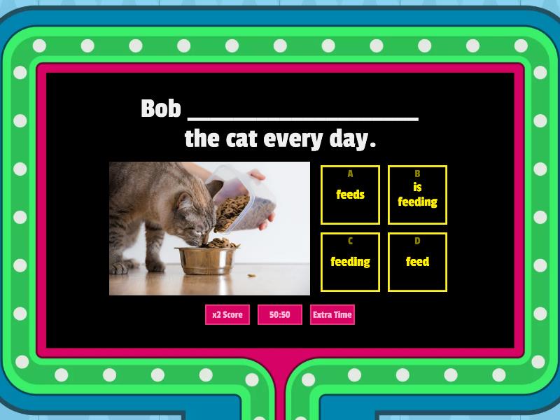 1) Bob ____________________ the cat every day. a) feeds b) is feeding c) feeding d) feed 2) Barbara ____________________ the flowers every day. a) waters b) is watering c) watering d) water 3) Bob ____________________ the flowers today. a) waters b) is watering c) watering d) water 4) Barbara ____________________ the dog today. a) walks b) is walking c) walking d) walk 5) Grandpa ____________________ in the garden every day. a) works b) is working c) working d) work 6) Dad ____________________ the dishes every day. a) washes b) is washing c) washing d) wash 7) Grandpa ____________________ the cat today. a) feeds b) is feeding c) feeding d) feed 8) Dad ____________________ in the garden today. a) works b) is working c) working d) work 9) Mum ____________________ the dog every day. a) walks b) is walking c) walking d) walk 10) Grandma ____________________ our dinner every day. a) cooks b) is cooking c) cooking d) cook 11) Mum ____________________ our dinner today. a) cooks b) is cooking c) cooking d) cook 12) Grandma ____________________ the dishes today. a) washes b) is washing c) washing d) wash