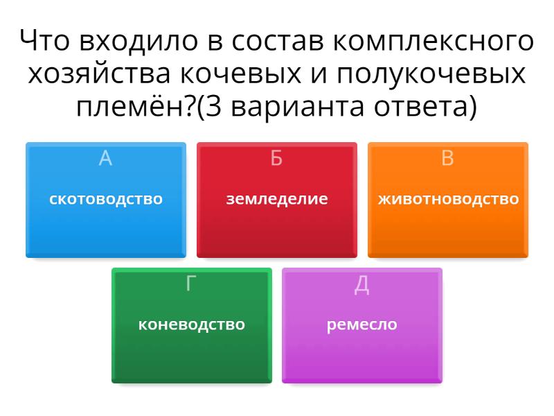 1) Что входило в состав комплексного хозяйства кочевых и полукочевых племён?(3 варианта ответа) a) скотоводство b) земледелие c) животноводство d) коневодство e) ремесло 2) сколько было созданно культурно-хозяйственных типов? a) 4 b) 2 c) 3 d) 1 e) 5 3) Что производил кочевой-скотоводческий тип хозяйства? a) продукты питания b) одежда,еда,украшения c) животноводческая продукция 4) какие регионы были торговыми центрами,связывавщими кочевую степь? a) Жетысу,Центральная Азия b) Жетысу,Пресырдарьинского c) Персия и Китай 5) Из чего были сделаны монеты,найденные при раскопках города Испиджаба? a) золото b) медь c) серебро d) бронза
