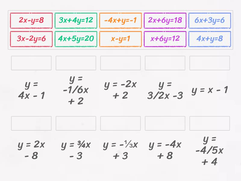 3x+4y=12 - y = ¾x - 3, 2x+6y=18 - y = -⅓x + 3, 2x-y=8 - y = 2x - 8, 6x+3y=6 - y = -2x + 2, 3x-2y=6 - y = 3/2x -3, -4x+y=-1 - y = 4x - 1, 4x+5y=20 - y = -4/5x + 4, x-y=1 - y = x - 1, x+6y=12 - y = -1/6x + 2, 4x+y=8 - y = -4x + 8,