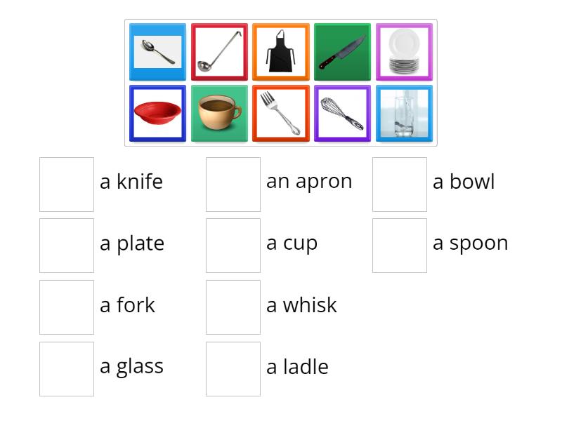 an apron, a ladle, a whisk, a fork, a spoon, a knife, a plate, a bowl, a glass, a cup,