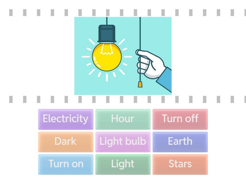 Turn on , Turn off , Dark, Light, Light bulb, Earth, Hour, Stars, Electricity,