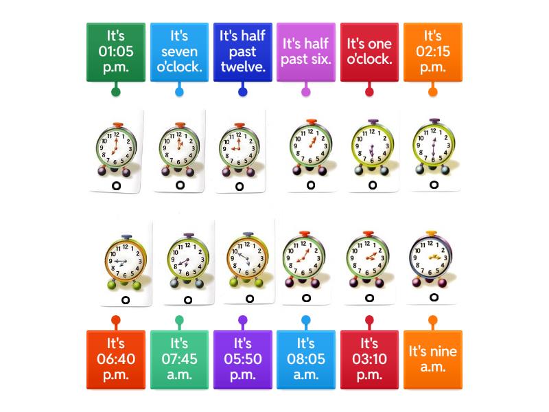 It's seven o'clock., It's one o'clock., It's nine a.m., It's 01:05 p.m., It's half past six., It's half past twelve., It's 07:45 a.m., It's 06:40 p.m., It's 05:50 p.m., It's 08:05 a.m., It's 03:10 p.m., It's 02:15 p.m..