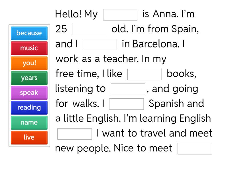 Hello! My ____ is Anna. I’m 25 ____ old. I’m from Spain, and I ____ in Barcelona. I work as a teacher. In my free time, I like ____ books, listening to ____, and going for walks. I ____ Spanish and a little English. I’m learning English ____ I want to travel and meet new people. Nice to meet ____