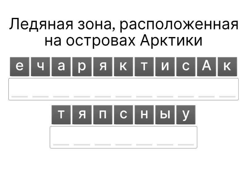 Арктическая пустыня - Ледяная зона, расположенная на островах Арктики, Белый медведь - Медведь, обитающий в Арктике, который ловит рыбу, Оленеводство - Основное занятие северных народов, Таймырский - Один из заповедников, находящихся в тундре,