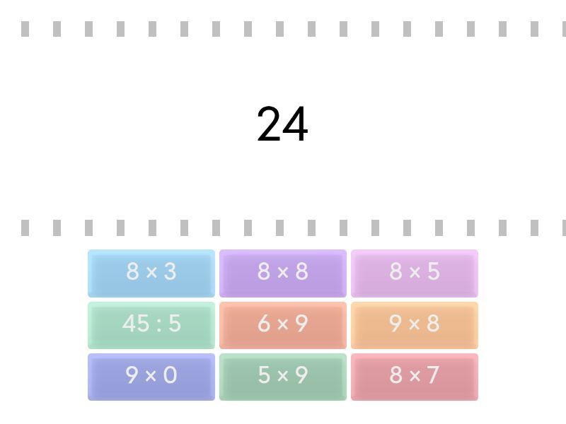 8 × 3 - 24, 8 × 7  - 56, 9 × 8  - 72 , 5 × 9 - 45 , 8 × 5 - 40 , 9 × 0 - 0 , 45 : 5 - 9 , 6 × 9 - 54 , 8 × 8 - 64,