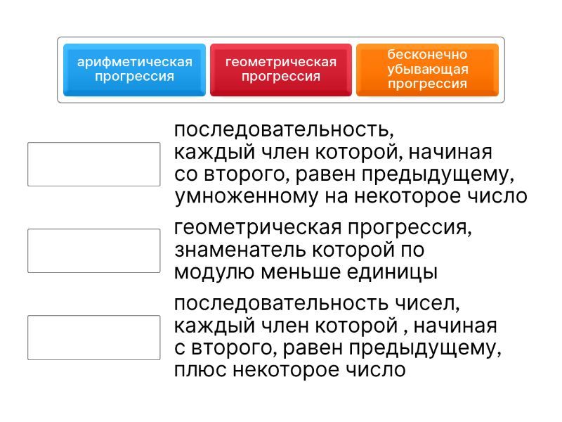 арифметическая прогрессия - последовательность чисел, каждый член которой , начиная с второго, равен предыдущему, плюс некоторое число, геометрическая прогрессия - последовательность, каждый член которой, начиная со второго, равен предыдущему, умноженному на некоторое число, бесконечно убывающая прогрессия - геометрическая прогрессия, знаменатель которой по модулю меньше единицы,