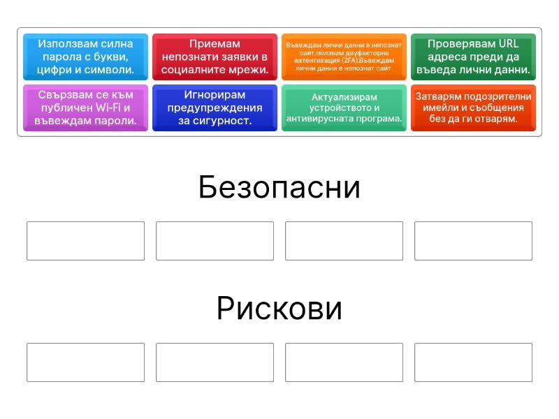 Безопасни: Проверявам URL адреса преди да въведа лични данни., Актуализирам устройството и антивирусната програма., Затварям подозрителни имейли и съобщения без да ги отварям., Използвам силна парола с букви, цифри и символи., Рискови: Въвеждам лични данни в непознат сайт.ползвам двуфакторна автентикация (2FA).Въвеждам лични данни в непознат сайт., Приемам непознати заявки в социалните мрежи., Свързвам се към публичен Wi-Fi и въвеждам пароли., Игнорирам предупреждения за сигурност.,