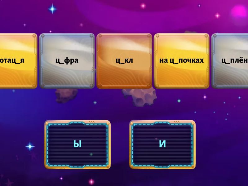 Ы: ц_ган, ц_плёнок, ц_плячий, ц_почка, ц_кнул, ц_ц, на ц_почках, синиц_, синиц_н, куц_й, бледнолиц_й, краснолиц_й, круглолиц_й, лисиц_н, куниц_н, сестриц_н, птиц_н, молодц_, глупц_, красавц_, И: ц_рк, ц_фра, ц_линдр, ц_фровой, ц_ферблат, ц_рковой, ц_трус, анимац_я, ц_корий, зац_кленный, ц_кл, традиц_я, акц_я, акац_я, нумерац_я, ц_тата, нотац_я, локац_я, позиц_я, иллюстрац_я,