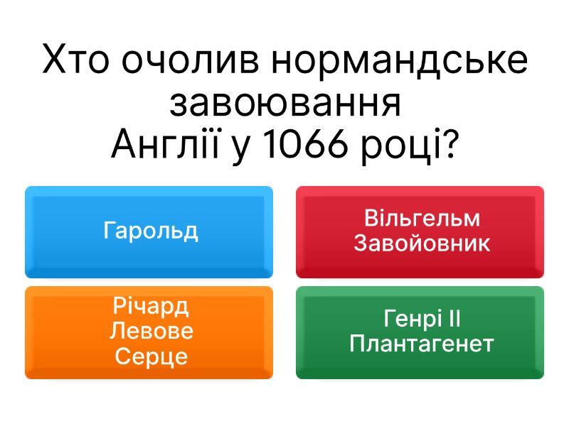 1) Хто очолив нормандське завоювання Англії у 1066 році? a) Гарольд b) Вільгельм Завойовник c) Річард Левове Серце d) Генрі II Плантагенет 2) Що стало наслідком битви під Гастінгсом у 1066 році? a) Вільгельм Завойовник став королем Англії b) Англія стала частиною Франції c) Англійці вигнали нормандців d) Англійський король уклав мир із Францією 3) Яку фортецю збудував Вільгельм Завойовник у Лондоні? a) Віндзор b) Кардіфф c) Тауер d) Единбурзький замок 4) Хто започаткував династію Плантагенетів в Англії? a) Вільгельм Завойовник b) Джон Безземельний c) Річард Левове Серце d) Генрі II Плантагенет 5) Що запровадив Генрі II Плантагенет у Англії? a) Податок на землю b) Суд присяжних c) Парламентське правління d) Магдебурзьке право 6) Хто з англійських королів більшість свого правління провів у війнах? a) Джон Безземельний b) Генрі II Плантагенет c) Річард I Левове Серце d) Вільгельм Завойовник 7) Який документ було ухвалено в Англії у 1215 році? a) Велика хартія вольностей b) Авіньйонський договір c) Кревська унія d) Магна Конкордія 8) Хто очолив повстання баронів проти короля Генріха III у XIII столітті? a) Генрі II b) Джон Безземельний c) Річард I d) Сімон де Монфор 9) Що започаткував «парламент Монфора» в Англії? a) Абсолютну монархію b) Станове представництво c) Військову диктатуру d) Федерацію міст 10) Які палати утворилися в англійському парламенті у XIV столітті? a) Палата міст і Палата селян b) Палата короля і Палата духовенства c) Палата лордів і Палата громад d) Палата баронів і Палата рицарів