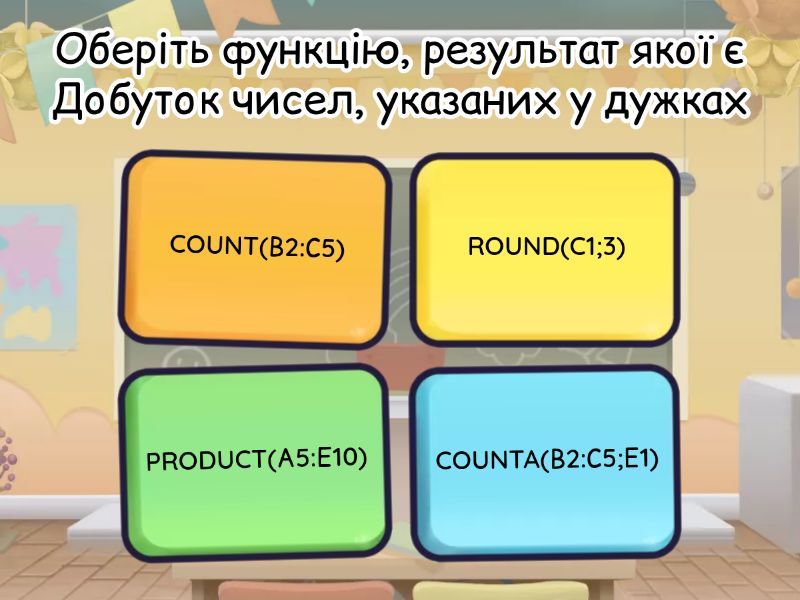 1) Оберіть функцію, результат якої є Добуток чисел, указаних у дужках a) COUNT(В2:С5) b) ROUND(C1;3) c) PRODUCT(А5:Е10) d) COUNTA(В2:С5;Е1) 2) Оберіть функцію, яка округлює число до цілих значень a) COUNT(В2:С5) b) ROUND(C1;0) c) PRODUCT(А5:Е10) d) COUNTA(В2:С5;Е1) 3) Оберіть функцію, яка підраховує кількість не порожніх клітинок a) COUNTIF(В2:С5;">90") b) ROUND(C1;3) c) PRODUCT(А5:Е10) d) COUNTA(В2:С5;Е1) 4) Оберіть функцію, яка підраховує кількість клітинок, які задовільнять певній умові a) COUNTIF(В2:С5;">90") b) ROUND(C1;3) c) PRODUCT(А5:Е10) d) COUNTA(В2:С5;Е1) 5) Математичні функції a) PRODUCT, COUNT b) PRODUCT, ROUND c) COUNT, COUNTIF 6) Статистичні функції a) PRODUCT, COUNT b) PRODUCT, ROUND c) COUNT, COUNTIF