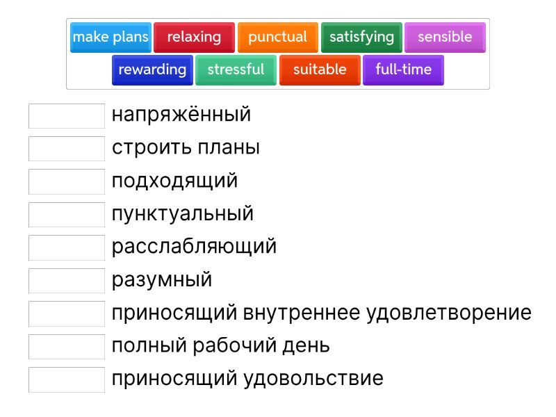 satisfying - приносящий удовольствие, rewarding - приносящий внутреннее удовлетворение, stressful - напряжённый, well-paid - хорошо оплачиваемый, part-time - частичная занятость, full-time - полный рабочий день, seasonal - сезонный, relaxing - расслабляющий, enjoyable - приятный, flexible - гибкий, organised - организованный, собранный, practical - практичный, punctual - пунктуальный, reliable - надежный, responsible - ответственный, sensible - разумный, suitable - подходящий, understandable - Понятный, cope with - справляться с чем-то, get your hands dirty - заняться практической работой, делать черную работу, keep an eye on - наблюдать за, make plans - строить планы, prove to someone - подтверждать, доказывать кому-то, be keen on playing games - увлекаться, put lots of effort in - прикладывать усилия, bring together - сводить вместе, сближать,
