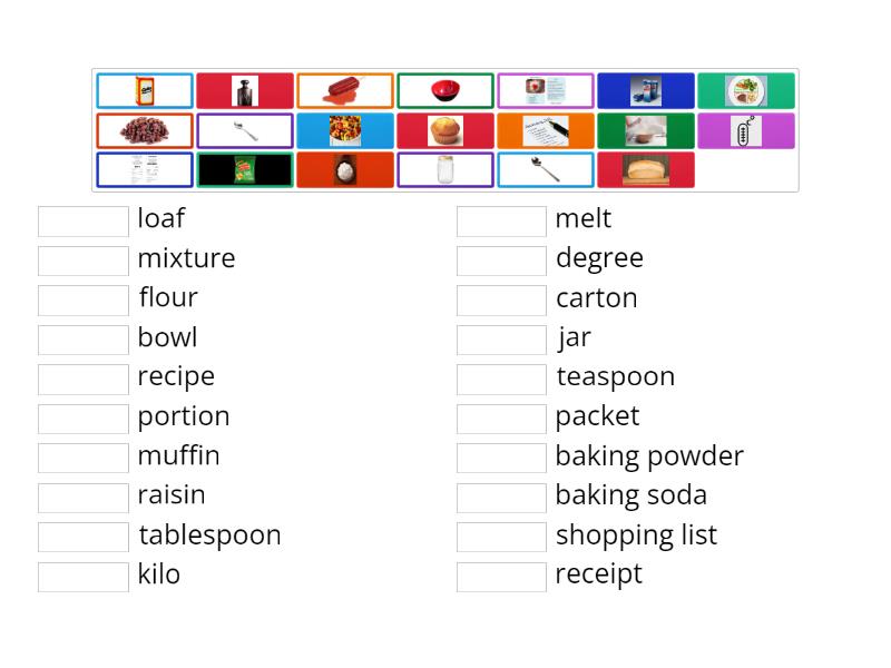 bowl, carton, degree, flour, jar, kilo, loaf, melt, mixture, muffin, packet, portion, raisin, receipt, recipe, tablespoon, teaspoon, baking powder, baking soda, shopping list,