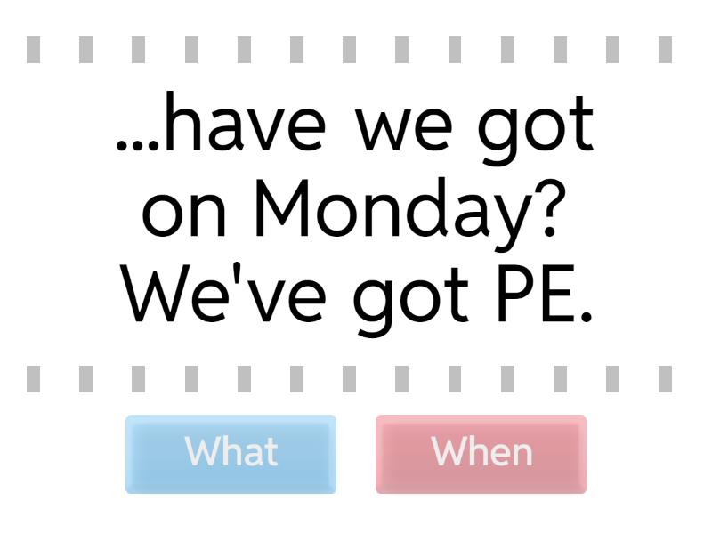 What: ...have we got on Monday? We've got PE., ...have we got on Tuesday? We've got Science., ...have we got on Thursday? We've got Maths., When: ...have we got Art? On Wednesday., ...have we got English? On Monday., ...have we got Science? On Tuesday.,
