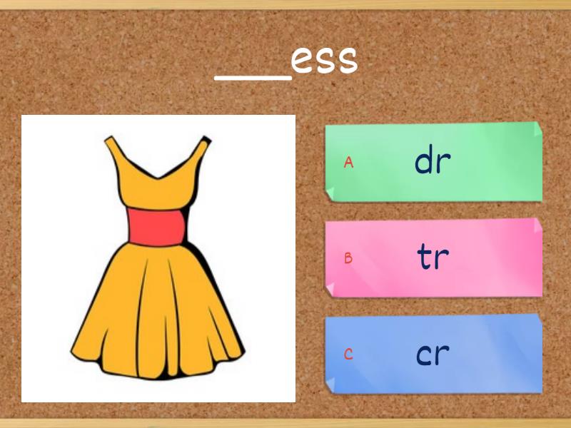 1) ___um a) dr b) tr c) cr 2) ___ess a) dr b) tr c) cr 3) ___uck a) dr b) tr c) cr 4) ___ee a) dr b) tr c) cr 5) ___ab a) dr b) tr c) cr 6) ___ayon a) dr b) tr c) cr
