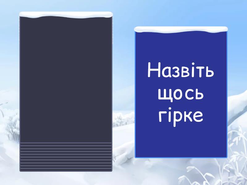 Назвіть щось зелене, Назвіть щось кисле, Назвіть щось пухнасте, Назвіть щось солодке, Назвіть щось гірке, Назвіть щось холодне, Назвіть щось гаряче, Назвіть щось золоте, Назвіть щось кругле, Назвіть щось тверде, Назвіть щось мокре, Назвіть щось м'яке.