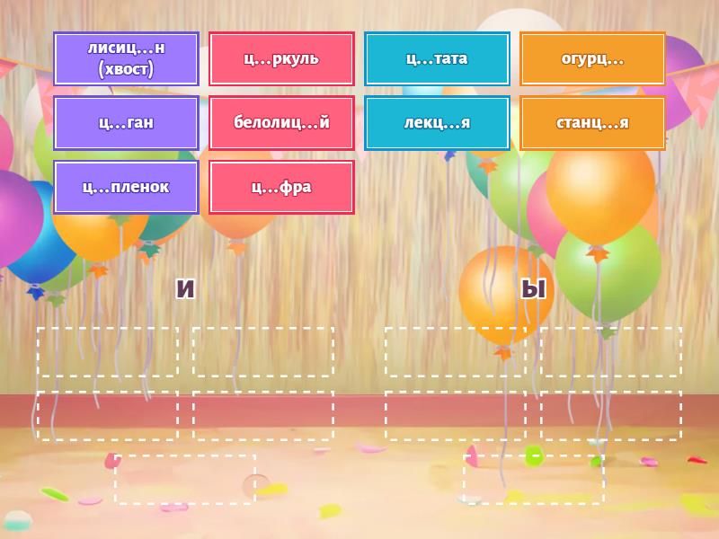 и: ц...фра , станц...я , лекц...я , ц...тата , ц...ркуль , ы: огурц... , ц...ган , лисиц...н (хвост), белолиц...й , ц...пленок ,
