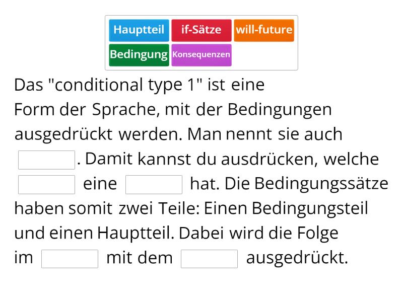 Das "conditional type 1" ist eine Form der Sprache, mit der Bedingungen ausgedrückt werden. Man nennt sie auch ____. Damit kannst du ausdrücken, welche ____ eine ____ hat. Die Bedingungssätze haben somit zwei Teile: Einen Bedingungsteil und einen Hauptteil. Dabei wird die Folge im ____ mit dem ____ ausgedrückt. If it ____ tomorrow, we ____ at home. If Bob ____ the kitchen, Anne ____ the bathroom. Andrew ____ the salad if Cam ____ it. If we ____ all of our tasks in school, we ____ have to do them at home. The test ____ easy if we ____ enough.