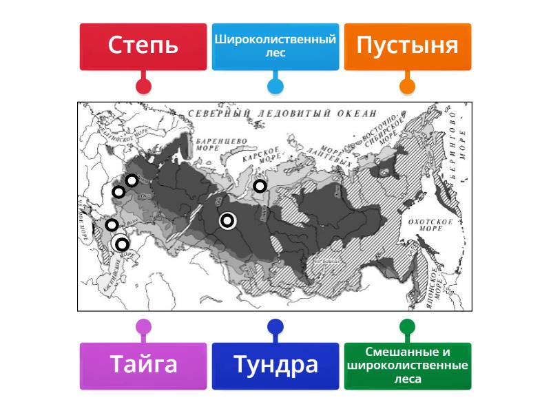 Широколиственный лес, Степь, Пустыня, Смешанные и широколиственные леса, Тайга, Тундра.