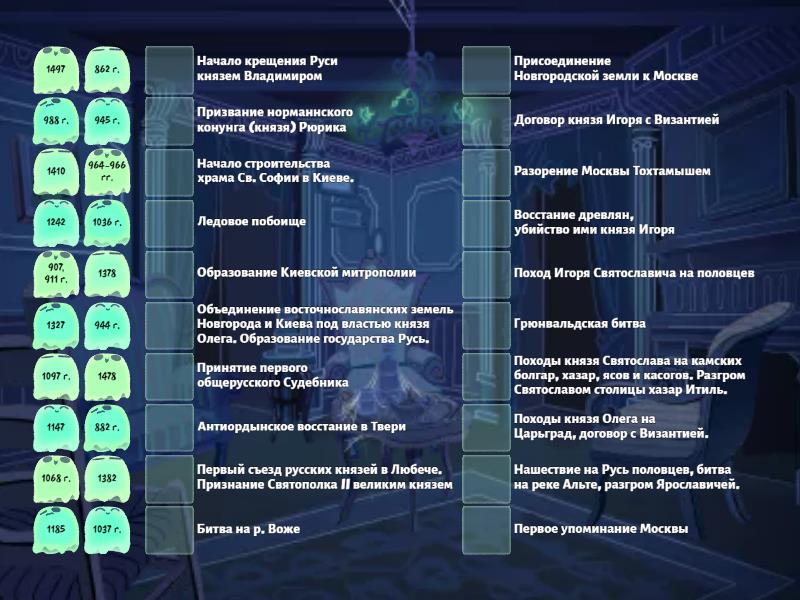 862 г. - Призвание норманнского конунга (князя) Рюрика, 882 г. - Объединение восточнославянских земель Новгорода и Киева под властью князя Олега. Образование государства Русь., 907, 911 г. - Походы князя Олега на Царьград, договор с Византией., 944 г. - Договор князя Игоря с Византией, 945 г. - Восстание древлян, убийство ими князя Игоря, 964-966 гг. - Походы князя Святослава на камских болгар, хазар, ясов и касогов. Разгром Святославом столицы хазар Итиль., 988 г. - Начало крещения Руси князем Владимиром , 1036 г. - Образование Киевской митрополии, 1037 г. - Начало строительства храма Св. Софии в Киеве., 1068 г. - Нашествие на Русь половцев, битва на реке Альте, разгром Ярославичей., 1097 г. - Первый съезд русских князей в Любече. Признание Святополка II великим князем, 1147 - Первое упоминание Москвы, 1185 - Поход Игоря Святославича на половцев, 1242 - Ледовое побоище, 1327 - Антиордынское восстание в Твери, 1378 - Битва на р. Воже, 1382 - Разорение Москвы Тохтамышем, 1410 - Грюнвальдская битва, 1497 - Принятие первого общерусского Судебника, 1478 - Присоединение Новгородской земли к Москве,