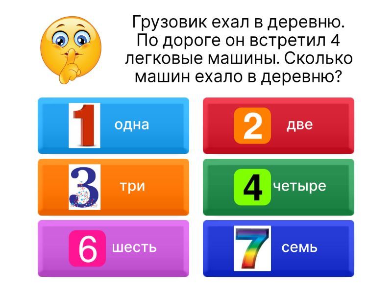 1) Грузовик ехал в деревню. По дороге он встретил 4 легковые машины. Сколько машин ехало в деревню? a) одна b) две c) три d) четыре e) шесть f) семь 2) Меня зовут Миша. У моей сестры только один брат. Как зовут брата моей сестры? a) Миша b) Паша c) Коля d) Петя e) Вова f) Дима 3) Вы опередили лыжника, который находился на второй позиции. Какое место теперь занимаете вы? a) первое b) второе c) третье d) четвертое e) пятое f) шстое 4) Три мальчика готовили елочные игрушки к Новому году. Втроем они работали 3 часа. Сколько часов работал каждый из них? a) час b) два c) ти d) четыре e) пять f) шесть 5) Какое число меньше 17 на 3? a) девять b) семь c) четырнадцать d) двенадцать e) два f) девяносто девять