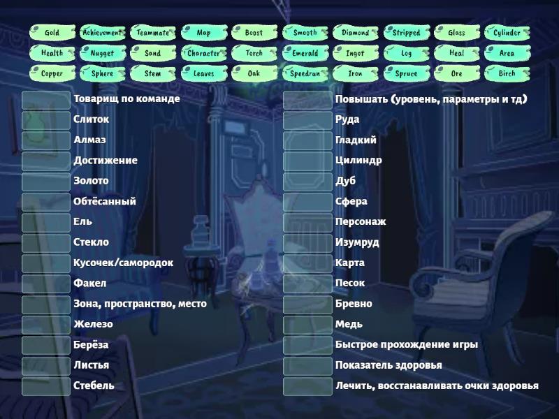 Speedrun - Быстрое прохождение игры, Teammate - Товарищ по команде, Torch - Факел, Heal - Лечить, восстанавливать очки здоровья, Health - Показатель здоровья, Achievement - Достижение, Area - Зона, пространство, место, Boost - Повышать (уровень, параметры и тд), Character - Персонаж, Map - Карта, Birch - Берёза, Oak - Дуб, Spruce - Ель, Stripped - Обтёсанный, Leaves - Листья, Stem - Стебель, Log - Бревно, Copper - Медь, Diamond - Алмаз, Emerald - Изумруд, Iron - Железо, Gold - Золото, Ore - Руда, Ingot - Слиток, Nugget - Кусочек/самородок , Sand - Песок, Glass - Стекло, Cylinder - Цилиндр, Sphere - Сфера, Smooth - Гладкий,