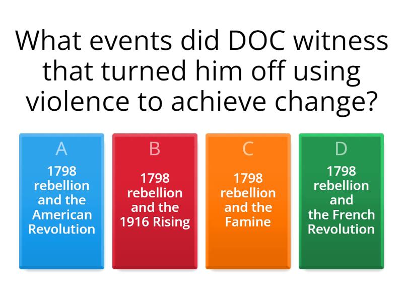 1) What events did DOC witness that turned him off using violence to achieve change? a) 1798 rebellion and the American Revolution b) 1798 rebellion and the 1916 Rising c) 1798 rebellion and the Famine d) 1798 rebellion and the French Revolution 2) What organisation did Daniel O'Connell set up? a) Catholic Emancipation b) Catholic Association c) United Irishmen d) Catholic Abolotion 3) What did DOC charge members of the Catholic Association to finance his campaign? a) Catholic penny b) Catholic money c) Catholic Rent d) Catholic Emancipation e) Catholic pike f) Catholic Union 4) How much was the Catholic rent? a) a penny a month b) a penny a week c) a penny a year d) a once once payment of a penny 5) What election did Daniel O'Connell win? a) Cavan by-election b) Clare by-election c) Kerry by-election d) Derry by-election e) Cork by-election f) Wicklow by-election 6) What did the Catholic relief Act do? a) charged members of the Catholic Association a penny a month b) allowed Catholics to take their seat in parlament? c) ended the 1801 Act of Union d) abolished slavery in England e) offered relef to Catholics during the Famine f) abolished the Irish parlament 7) What was the aim of the Catholic Association a) get weapons to fight the French b) end to the feudal system c) establishing an independent Irish Republic d) plot a rebellion e) fight for Protestant Emancipation f) fight for Catholic Emancipation using peaceful methods 8) Daniel O’Connell was an abolitionist. What does this mean a) He wanted to plot a rebellion b) he wanted to abolish the Catholic Rent c) he wanted to abolish slavery d) he wanted to abolish the physical force tradition e) he wanted to abolish peaceful meetings f) he wanted to abolish the Catholic rent 9) What did O'Connell want to repeal? a) Catholic rent b) the 1801 Act of Union c) English Censorship d) Catholic's rights e) the 1801 Amendment Act f) the 1801 Act of Ulster 10) What did O’Connell set up the in 1840 to campaign for the repeal of the Act of Union? a) Repeal Association b) Repeal Rent c) Repeal Emancipation d) Repeal the Union e) Repeal Abolotion f) Repeal campaign 11) In what year did O’Connell set up the Repeal Association? a) 1829 b) 1833 c) 1840 d) 1845 e) 1798 f) 1480 12) Which is the out one out? a) Slavery abolition Act 1833 b) Repeal Association 1840 c) Catholic Relief Act (1829) d) Catholic Association e) Catholic Rent f) 1798 rebellion 13) What title was DOC given after Catholic Emancipation was granted in 1829? a) The Counsellor b) Chancellor c) Supreme Leader d) The Liberator e) Prime Minister f) The Chairman 14) The central tactic in Daniel O'Connell's campaign for repeal of the Act of Union in 1843 was the holding meetings. What did this meetings become known as? a) Manchester meetings b) mastery meetings c) Emancipation meetings d) Monster meetings e) Catholic meetings f) Tara meetings 15) How many people showed up to a monster meeting held on the hill of Tara? a) 70,000 b) 75,000 c) 175,000 d) 750,000 e) 500,000 f) 700,000 16) Which of these were tactics DOC used to achieve change a) passionate speeches b) holding peaceful meetings c) setting up organisations to lobby for change d) putting pressure on politicians  to act in their favour e) organizing an uprising f) organizing weapons  17) Tick true statements about Daniel O'Connell a) DOC was committed to only using peaceful and legal means to achieve change. b) People had to pay a pound a month subscription to belong to the Catholic Association c) The Catholic Relief Act 1829 ended the Act of Union. d) He founded the Catholic Association to campaign for Catholic Emancipation e) O’Connell was an abolitionist which means he wanted to keep slavery. f) He also held peaceful meetings to put pressure on the British government 18) Tick true statements about Daniel O'Connell a) After his successful campaign for Catholic Emancipation, O’Connell led a campaign to repeal the Act of Union. b) DOC wanted to establish a separate and independent parliament in Dublin. c) He set up the Repeal association in 1840 with a Catholic rent. d) The repeal rent went to upgrading Irish weapons from pikes to guns e) O’Connell failed to repeal the union. f) One of O’Connell last political acts was to plead with the government for help for the Irish people during the 1798 rebellion. 19) Tick true statements about Daniel O'Connell a) He achieved Catholic Emancipation and repealed various penal laws b) He inspired later Nationalist leaders to campaign for self-government c) O’Connell succeeded in repealing the union. d) Daniel O’Connell was the most important political leader in the first half of the 19th century. e) Parnell created a disciplined political party which others copied later. f) He proved peaceful methods can achieve big things