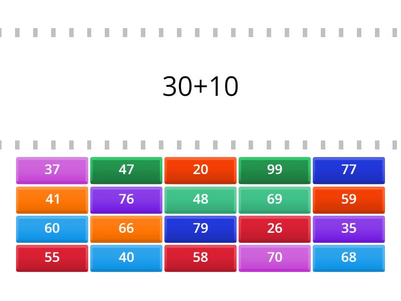 40 - 30+10, 58 - 22+36, 66 - 33+33, 99 - 32+67, 37 - 20+17, 77 - 55+22, 69 - 19+50, 20 - 11+9, 35 - 5+30, 60 - 39+21, 26 - 11+15, 41 - 20+21, 47 - 34+13, 70 - 6+64, 79 - 39+40, 48 - 38+10, 59 - 30+29, 76 - 5+71, 68 - 44+14, 55 - 22+33,