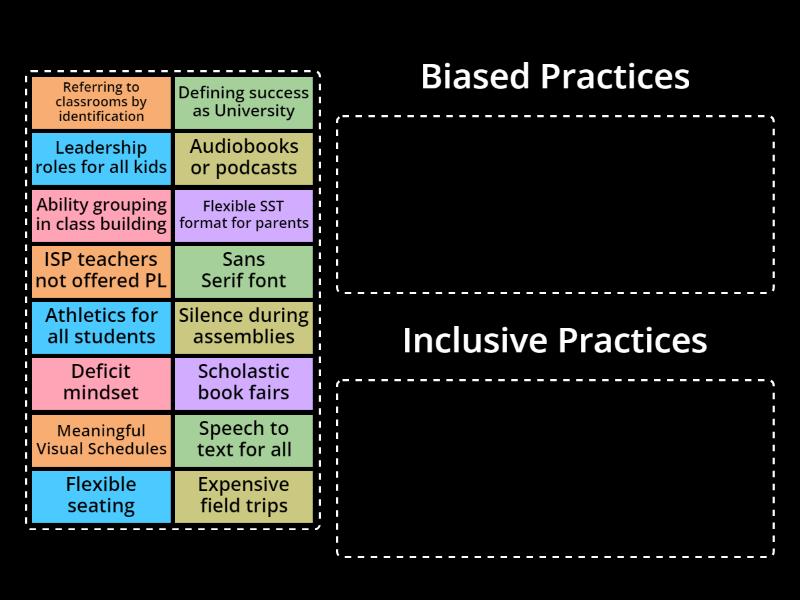 Biased Practices: ISP teachers not offered PL, Referring to classrooms by identification, Ability grouping in class building, Deficit mindset, Defining success as University , Expensive field trips, Scholastic book fairs, Silence during assemblies, Inclusive Practices: Speech to text for all , Flexible seating, Leadership roles for all kids, Athletics for all students, Flexible SST format for parents, Meaningful Visual Schedules, Audiobooks or podcasts, Sans Serif font,
