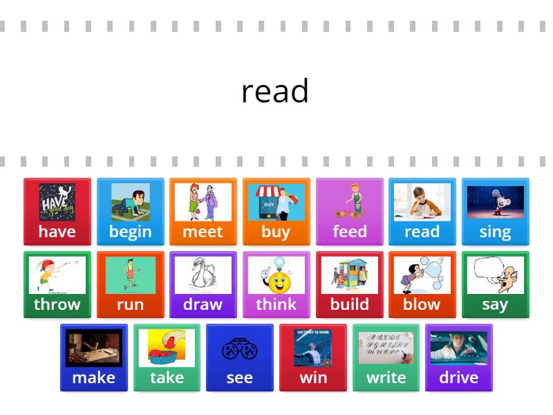 read - read, have - had, buy - bought, say - said, feed - fed, see - saw, write - wrote, blow - blew, draw - drew, sing - sang, build - built, meet - met, throw - threw, think - thought, make - made, take - took, run - ran, drive - drove, begin - began, win - won,