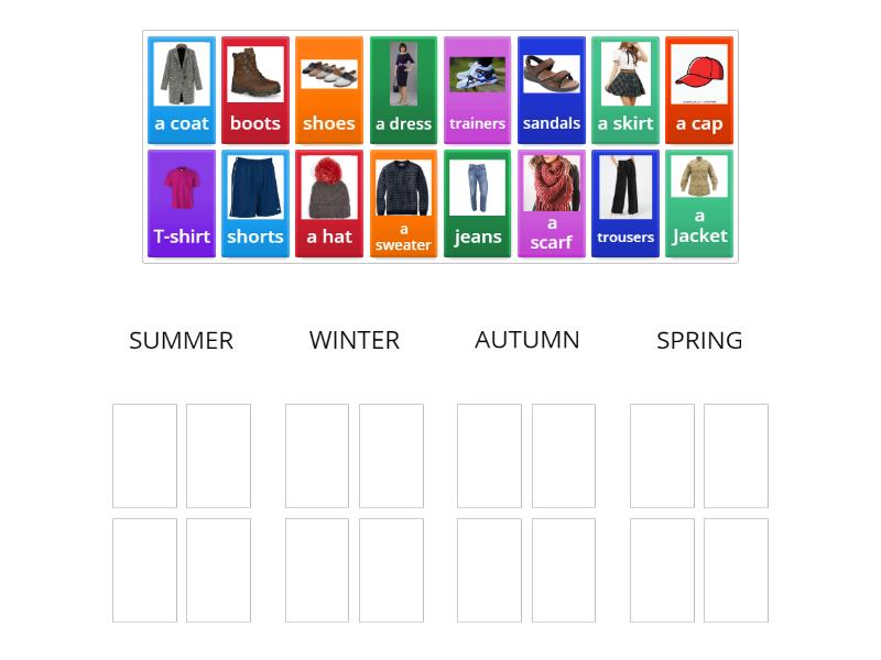 SUMMER: sandals, shorts, T-shirt, a cap, WINTER: boots, a scarf, a hat, a coat, AUTUMN: a Jacket, jeans, a sweater, shoes, SPRING: a dress, trousers, trainers, a skirt,