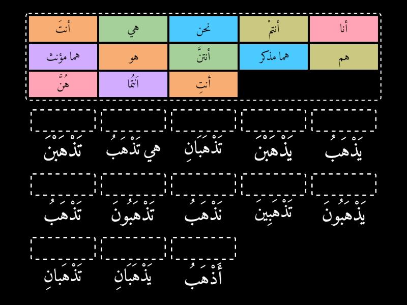 أنا - أَذْهَبُ, أنتَ - تَذْهَبُ, أنتِ - تَذْهَبِينَ, هو - يَذْهَبُ, هي - هي تَذْهَبُ, نحن - نَذْهَبُ, اَنتُما - تَذْهَبَانِ, هما مذكر - يَذْهَبَانِ, هما مؤنث - تَذْهَبانِ, أنتمْ - تَذْهَبُونَ, أنتنَّ - تَذْهَبْنَ, هم - يَذْهَبُونَ, هُنَّ - يَذْهَبْنَ,