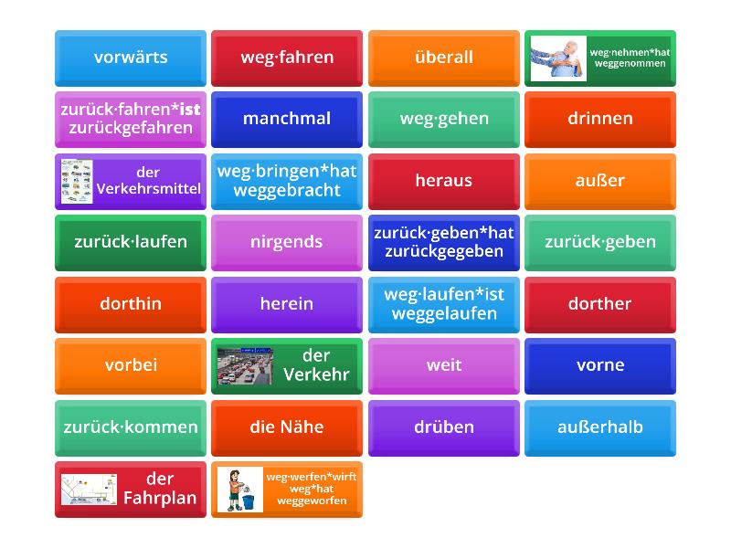 der Verkehr - транспорт, der Verkehrsmittel - транспортное средство, der Fahrplan - план поездки, dorther - оттуда, heraus - наружу, herein - внутрь, vorbei - мимо, dorthin - туда, vorwärts - вперед, vorne - впереди, außer - снаружи, außerhalb - за пределами, drinnen - внутри , drüben - с другой стороны ,с той стороны, nirgends - нигде, überall - везде, weit - далеко , die Nähe - близость, weg·bringen*hat weggebracht - унести, weg·fahren - уехать, weg·gehen - уйти, weg·laufen*ist weggelaufen - убежать, weg·nehmen*hat weggenommen - отнять, weg·werfen*wirft weg*hat weggeworfen - выбросить, zurück·fahren*ist zurückgefahren - ехать обратно, zurück·geben*hat zurückgegeben - отдать обратно, zurück·geben - идти обратно, zurück·kommen - вернуться, zurück·laufen - бежать обратно, manchmal - иногда,