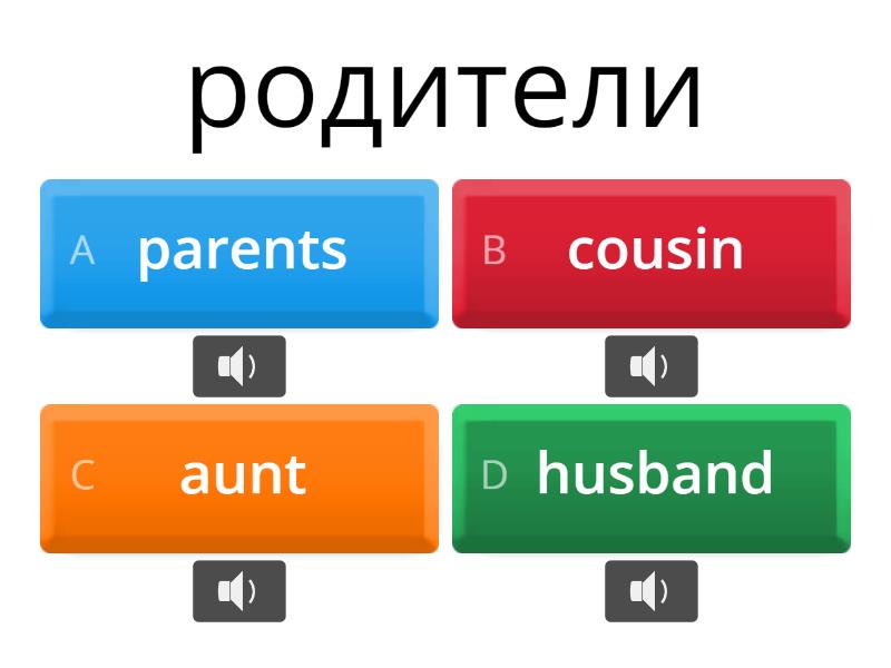 1) родители a) parents b) cousin c) aunt d) husband 2) дети a) grandson b) brother c) husband d) children 3) сын a) daughter b) granddaughter c) parents d) son 4) брат a) brother b) grandparents c) grandmother d) parents 5) сестра a) sister b) brother c) cousin d) grandfather 6) бабушки и дедушки a) great-grandmother b) grandparents c) granddaughter d) grandmother 7) дочь a) daughter b) children c) grandson d) grandfather 8) дедушка a) son b) grandfather c) brother d) uncle 9) бабушка a) wife b) sister c) grandson d) grandmother 10) внучка a) daughter b) cousin c) relatives d) granddaughter 11) внук a) grandson b) daughter c) son d) niece 12) тетя a) aunt b) wife c) brother d) nephew 13) дядя a) uncle b) daughter c) grandmother d) children 14) племянник a) nephew b) great-grandmother c) aunt d) husband 15) племянница a) uncle b) son c) niece d) aunt 16) двоюродный брат (кузен) / сестра (кузина) a) grandson b) uncle c) son d) cousin 17) муж a) husband b) brother c) nephew d) cousin 18) жена a) grandson b) cousin c) grandmother d) wife 19) родственники a) wife b) great-grandmother c) grandson d) relatives 20) прабабушка a) granddaughter b) great-grandmother c) grandfather d) relatives