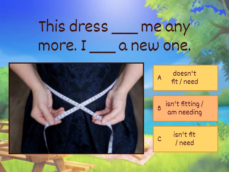 1) This dress ___ me any more. I ___ a new one. a) doesn't fit / need b) isn't fitting / am needing c) isn't fit / need 2) Your perfume ____ nice. a) smell b) smells c) is smelling 3) In this photo the girl ____ the flowers. a) smell b) smells c) is smelling 4) You’re a great cook! This cake ………wonderful. a) tastes b) taste c) is tasting 5) In this photo a man and a woman ……… cakes. a) taste b) is tasting c) are tasting 6) The referee …….. to cancel the match because it……….. heavily now. a) want / is rain b) wants / is raining c) wants / rains 7) Sarah ……… I …… generous. a) think / is b) thinks / being c) thinks / am 8) A: Is anything wrong? B: No, I ......... about what to do next. a) just think b) am just thinking c) just thinking 9) A: What's that noise? B: Our neighbours ........ a party . a) have b) having c) are having 10) A: The children .......... a lot of noise today. B: I know, but they ........ fun. a) are making / have b) are making / are having c) make / have 11) Sorry, I ......... what you ........ a) am not understand / meaning b) don't understand / mean c) don't understand / are meaning 12) A: What's wrong? B: I ......... for my keys. a) am looking b) look c) looking 13) Are you ok? You ......... very tired. a) are look b) look c) are looking 14) Whose is that bag? Who .... it ... to? a) is it belonging b) is it belong c) does it belong 15) Some people just ...... to realize that the world has changed. a) aren't seem b) aren't seeming c) don't seem 16) I ....... that you ....... the latest news, right? a) suppose / know b) supposing / knowing c) am supposing / are know 17) .... you .... how dangerous this is? a) Do you realize b) Are you realize c) Are you realizing 18) I ....... in life after death. a) not believe b) don't believe c) isn't believe
