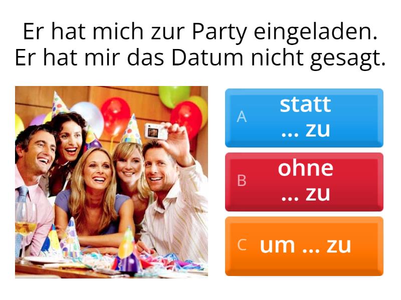 1) Er hat mich zur Party eingeladen. Er hat mir das Datum nicht gesagt. a) statt ... zu b) ohne ... zu c) um ... zu 2) Er ist die Treppe hochgelaufen. Er hat den Aufzug nicht benutzt. a) statt ... zu b) ohne ... zu c) um ... zu 3) Er holte die Gießkanne. Er wollte die Blumen gießen. a) statt ... zu b) ohne ... zu c) um ... zu 4) Sie verkaufte das Auto. Sie sagte niemandem in der Familie etwas. a) statt ... zu b) ohne ... zu c) um ... zu 5) Sie kauft die Bluse. Sie probiert sie nicht an. a) statt ... zu b) ohne ... zu c) um ... zu 6) Sie geht ein paar Schritte zurück. Sie will ein Foto machen. a) statt ... zu b) ohne ... zu c) um ... zu 7) Sie telefoniert mit dem Hotel. Sie will ein Zimmer reservieren. a) statt ... zu b) ohne ... zu c) um ... zu 8) Er geht nach Hause. Er verabschiedet sich nicht. a) statt ... zu b) ohne ... zu c) um ... zu 9) Tim geht lieber spazieren. Er sieht nicht fern. a) statt ... zu b) ohne ... zu c) um ... zu 10) Ich lerne Deutsch. Ich möchte in Deutschland arbeiten. a) statt ... zu b) ohne ... zu c) um ... zu