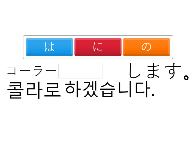 コーラー____ します。 콜라로 하겠습니다. おちゃに ____ 。 차로 할래. ____に する。 가츠동으로 할래. うどん ____ ____ 。 우동으로 하겠습니다. ____に ____ 。 사과로 하겠습니다. すきやき____ ____ 。 스키야키로 할래. オレンジ ____ 오렌지 주세요. ____ ください。 물 주세요. りんご ____ ください。 사과 3개 주세요. カレー ふたつ____ ジュース ____ くだたい。 카레 2개와 쥬스 1개 주세요.