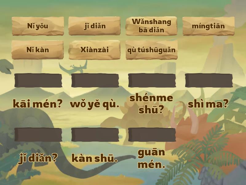Xiànzài - jǐ diǎn?, Nǐ yǒu - shì ma?, qù túshūguǎn - kàn shū., Nǐ kàn - shénme shū?, jǐ diǎn - kāi mén?, Wǎnshang bā diǎn - guān mén., míngtiān - wǒ yě qù.,
