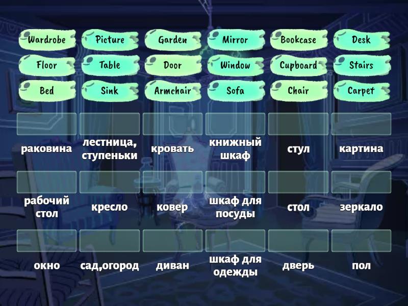 Bookcase - книжный шкаф , Desk - рабочий стол , Wardrobe - шкаф для одежды , Bed - кровать, Door - дверь, Sink - раковина , Window - окно, Cupboard - шкаф для посуды , Mirror - зеркало , Table - стол , Chair - стул , Armchair - кресло , Stairs - лестница, ступеньки , Sofa - диван , Garden - сад,огород , Floor - пол , Picture - картина , Carpet - ковер ,