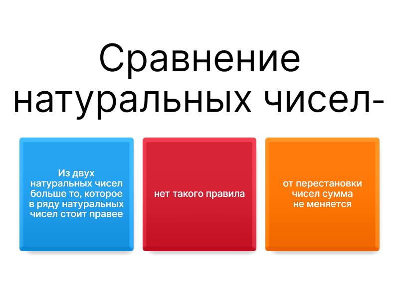 1) Сравнение натуральных чисел- a) Из двух натуральных чисел больше то, которое в ряду натуральных чисел стоит правее b) нет такого правила c) от перестановки чисел сумма не меняется 2) свойства сложения- a) нет такого b) от перестановки слагаемых сумма не меняется 3) арифметика- a) царица математики b) сложение c) счет 4) математика- a) в школе проходим b) не любимый предмет c) царица всех наук d) формулы 5) счет дружбы- a) не портит b) портит 6) (4*4*4*4*5*5*5*5*5)-1000= a) 20000 b) 695 c) 799000 d) 899000 7) семеро одного- a) бьют b) обзывают c) не поддерживают d) не ждут 8) 40000 - 39968 + 71 - 4 · 2 · 3328 : 13312; a) 101 b) 100 c) 102 d) 103 9) (9 + 33874 - 33875) · (11362 - 79 + 6) : 852 a) 102 b) 103 c) 104 d) 101 e) 105 f) 106 10) На дереве сидели 2 галки и смотрели в разные стороны: одна на восток, а другая на запад. Одна галка говорит: «У тебя крылья грязные». Другая ей отвечает: «А у тебя хвост запачкан». Каким образом они видят друг на друге грязь, если смотрят в противоположные стороны? a) море b) они увидели грязь друг на друге до того, как начали смотреть в разные стороны c) прохожих d) футбольный мач 11) Что у моря одна, у водопада две, у болота три, а у реки этого нет? a) глубина b) грязь c) вода 12) Когда строят дом, во что вбивают первый гвоздь? a) в валенок b) в ногу c) в голову d) в шляпку 13) Можно ли носить воду в сите? a) да b) нет c) если сито мелкое, то можно. 14) Петух весит на одной ноге 4 кг, а на двух сколько? a) 4 кг b) 3,5-пузо в тинул 15) Двое играли в шашки четыре часа. Сколько часов играл каждый из них? a) 8 b) 4 16) 63913 - 535 - 38974 : 19487 · 58 + 6738 - 69699 a) 301 b) 305 c) 307 d) 302 17) Мишу угостили конфетами. Половину конфет он съел, а оставшиеся 5 конфет отнёс брату. Сколько конфет дали Мише? a) 5 b) 10 c) 15 d) 0 18) Ваня, Шурик и Антон были на рыбалке. Каждый из них поймал разное количество рыб. Ваня и Шурик вместе поймали 6 рыб, а Антон и Ваня — 4 рыбы. Сколько рыб поймал каждый из мальчиков? a) Ваня — 1 рыбу, Шурик — 5 рыб, Антон — 3 рыбы. b) ваня-1 рыбу, Шурик- 5 рыб, остальные не чего 19) На уроке физкультуры дети выстроились в одну шеренгу с интервалом 1 м. Шеренга растянулась на 20 м. Сколько детей было на уроке? a) 23 b) 20 c) 21 d) 22 20) Оле нужно засадить саженцами помидоров ряд длиной 3 м. Расстояние между саженцами 30 см. Сколько саженцев помидоров надо заготовить для посадки? a) 11 b) 12 c) 13 d) 10