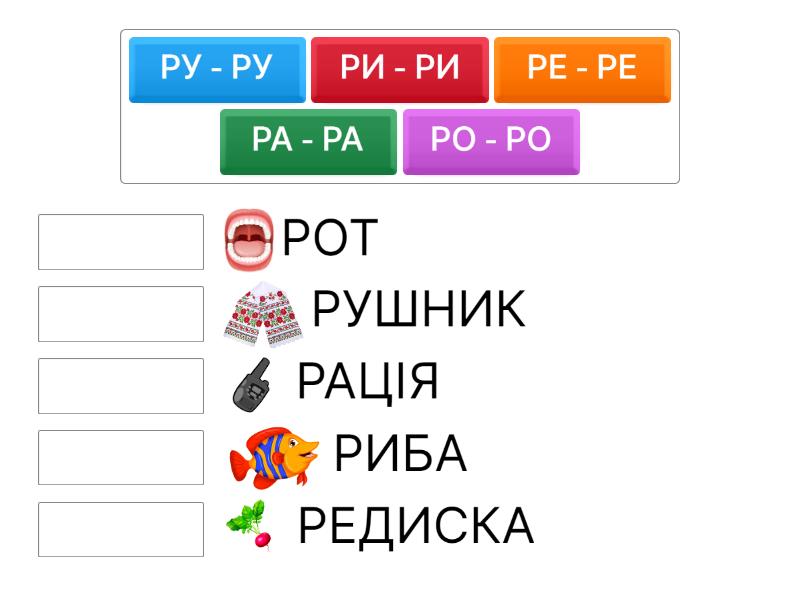 РИ - РИ - РИБА, РЕ - РЕ - РЕДИСКА, РУ - РУ - РУШНИК, РО - РО - РОТ, РА - РА - РАЦІЯ,