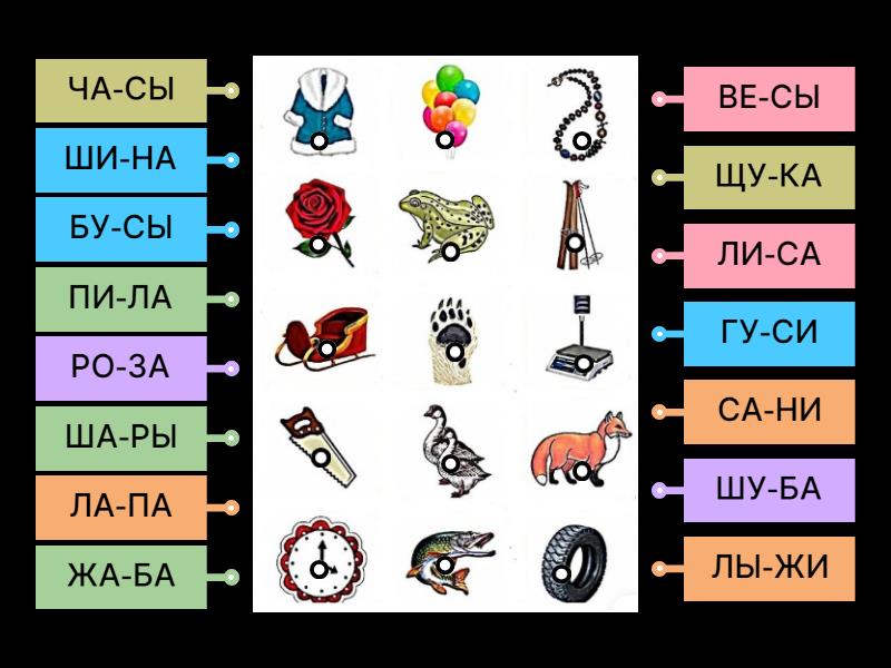 ЛА-ПА, ЖА-БА, ГУ-СИ, ЧА-СЫ, ЛИ-СА, ШУ-БА, ЛЫ-ЖИ, ПИ-ЛА, БУ-СЫ, ЩУ-КА, ВЕ-СЫ, РО-ЗА, СА-НИ, ША-РЫ, ШИ-НА.
