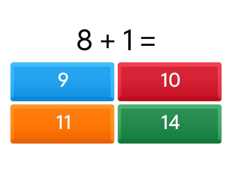 1) 8 + 1 = a) 9 b) 10 c) 11 d) 14 2) 1 + 0 = a) 1 b) 2 c) 4 d) 5 3) 9 + 1 = a) 8 b) 9 c) 10 d) 12 4) 4 + 5 = a) 7 b) 11 c) 9 d) 18 5) 7 + 2 = a) 7 b) 6 c) 9 d) 5 6) 8 + 0 = a) 5 b) 8 c) 9 d) 0 7) 8 + 2 = a) 7 b) 10 c) 6 d) 1 8) 5 + 1 = a) 10 b) 13 c) 6 d) 19 9) 5+ 3 = a) 8 b) 10 c) 5 d) 7 10) 4 + 3 = a) 1 b) 10 c) 8 d) 7