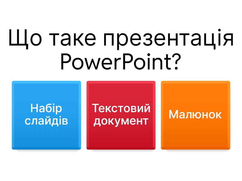 1) Що таке презентація PowerPoint? a) Набір слайдів b) Текстовий документ c) Малюнок 2) Як називається перший слайд презентації, на якому зазвичай пишуть назву і автора? a) Титульний слайд b) Останній слайд c) Змістовний слайд 3) Що можна вставляти в слайд PowerPoint? (Можна вибрати кілька варіантів) a) Текст b) Код (програмування) c) Зображення d) Аудіо і відео 4) Які режими перегляду презентації існують? (Кілька правильних відповідей) a) Звичайний (Editing) b) Показ слайдів (Slide Show) c) Сортувальник слайдів (Slide Sorter) d) Режим читання 5) Яке розширення має файл PowerPoint у сучасних версіях? a) .ppt b) .docx c) .pptx 6) У якому меню/вкладці знаходиться функція «Вставлення зображення»? a) Основне (Home) b) Вставлення (Insert) c) Конструктор (Design)