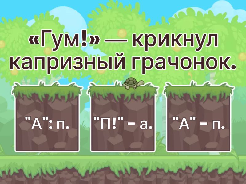 1) «Гум!» — крикнул капризный грачонок. a) "А": п. b) "П!" - а. c) "А" - п. 2) «Что это за птица с крыльями без перьев?" — спросил грачонок. a) "П?" - а. b) "А" - а. c) "П" - а. 3) Брат сказал: "Я хочу с тобой поехать". a) А: "П". b) П: "А". c) А: "П!" 4) Ещё накануне Дерсу говорил мне: "В этих местах бродит много тигров". a) А: "П"! b) А,- "П". c) А: "П". 5) "Славная погода завтра будет", - заметил я. a) "П", - п... b) "П", - а. c) "А", - а. 6) Петька встретил меня ворчаньем: «Ты что так долго?» a) А: "П". b) А: "П!" c) А: "П?" 7) «А как ее звать?» – спрашивают ребята. a) "П?" а. b) "П?" - а. c) "П"? - а. 8) Ребята после этого вовсе на голубую змейку осердились: «Не будем о ней говорить!» a) "П!" - а. b) "П", - а. c) А: "П!"