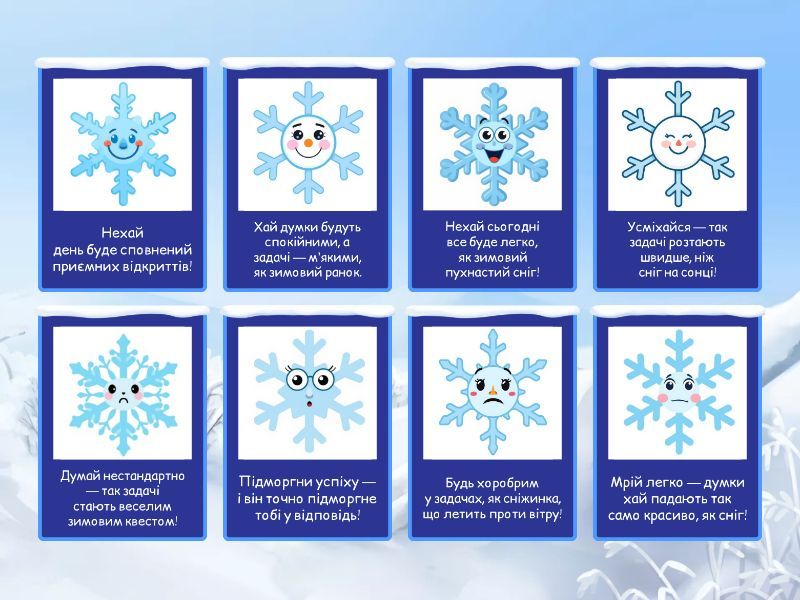 Нехай сьогодні все буде легко, як зимовий пухнастий сніг! - На гілочках сніжинки по 6 променів. Скільки всього променів у 4-х таких сніжинок?, Підморгни успіху — і він точно підморгне тобі у відповідь! - Три сніжинки впали на вікно, а ще стільки ж — на рукавицю. Скільки всього сніжинок?, Мрій легко — думки хай падають так само красиво, як сніг! - Якщо кожна сніжинка має 6 променів, то скільки променів у 2 з половиною сніжинок?, Будь хоробрим у задачах, як сніжинка, що летить проти вітру! - На землі лежить 10 сніжинок. Вітер підняв 3. Скільки залишилося?, Хай думки будуть спокійними, а задачі — м’якими, як зимовий ранок. - Сніжинка спить на 6-променевій подушці. Скільки ще треба променів, щоб подушка стала 10-променевою?, Усміхайся — так задачі розтають швидше, ніж сніг на сонці! - На малюнку 12 маленьких сніжинок. Половина з них «засміялася». Скільки це?, Нехай день буде сповнений приємних відкриттів! - На підлогу впало 7 сніжинок, а потім ще на 3 більше. Скільки впало вдруге?, Думай нестандартно — так задачі стають веселим зимовим квестом! - У коробці 9 сніжинок. 3 з них — «хитрі». Яка частина всіх сніжинок хитра?,