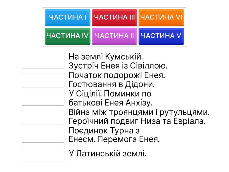 ЧАСТИНА І - Початок подорожі Енея. Гостювання в Дідони. , ЧАСТИНА ІІ - У Сіцілії. Поминки по батькові Енея Анхізу. , ЧАСТИНА ІІІ - На землі Кумській. Зустріч Енея із Сівіллою., ЧАСТИНА ІV - У Латинській землі. , ЧАСТИНА V - Війна між троянцями і рутульцями. Героїчний подвиг Низа та Евріала., ЧАСТИНА VІ - Поєдинок Турна з Енеєм. Перемога Енея.,