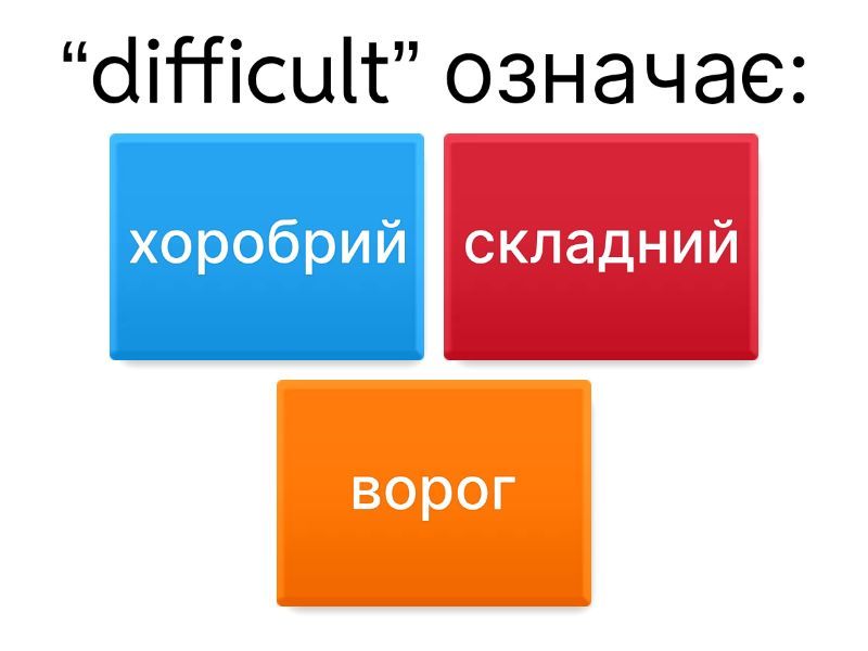 1) “difficult” означає: a) хоробрий b) складний c) ворог 2) “tough” означає: a) жорсткий / грубий b) король c) битися 3) “dangerous” — це: a) небезпечний b) обслуговування c) багатий чоловік 4) “rough ” означає: a) їжа b) грубий c) повна зайнятість 5) “knight” — це: a) молодий чоловік b) сторож c) лицар 6) “armour” — це: a) обладунки / броня b) королева c) просити 7) “nearby” означає: a) продовжувати b) поблизу / неподалік c) обіцяти 8) “fight” — це: a) битися b) жаліти c) спати 9) “continue” означає: a) королева b) молодий c) продовжувати 10) “weapon” — це: a) зброя b) ворог c) король 11) “serve” означає: a) обіцяти b) їжа c) слугувати / обслуговувати 12) “meal” — це: a) стерегти b) їжа c) молодий 13) “guard” означає: a) стерегти b) робота c) в минулому 14) “service” — це: a) їжа b) обслуговування c) хоробрий 15) “promise” — це: a) обіцяти b) хоробрий c) ставати ворогом 16) “full-time job” означає: a) робота на повний робочий день b) обслуговування c) просити 17) “in the past” — це: a) молодий b) в минулому c) багатий 18) “job” означає: a) робота b) ворог c) бій 19) “brave” — це: a) хоробрий b) зброя c) король 20) “rich man” — це: a) молодий чоловік b) багатий чоловік c) ворог 21) “ask” означає: a) просити / запитати b) король c) битися 22) “young” означає: a) їжа b) молодий c) бронювання 23) “king” — це: a) король b) королева c) сторож 24) “queen” — це: a) обладунки b) принц c) королева 25) enemy a) ворог b) хоробрий c) їжа